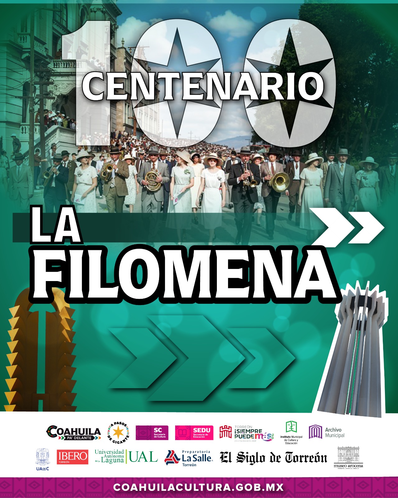 Torreón, Coahuila a 31 de enero de 2026.- En el marco del centenario de la apropiación de la emblemática pieza musical “La Filomena”, la Secretaría de Cultura de Coahuila, en coordinación con instituciones educativas, culturales y el Municipio de Torreón, impulsa un programa de actividades conmemorativas que reconocen a esta obra como uno de los símbolos más representativos de la identidad lagunera.