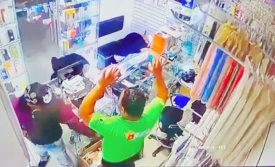 En la grabación que circula en redes sociales se puede apreciar que el encargado del negocio de reparación y venta de celulares se encontraba interactuando tranquilamente con un cliente cuando de pronto dos sujetos irrumpieron en el negocio, los someten y les indican que se mantengan con las manos arriba.