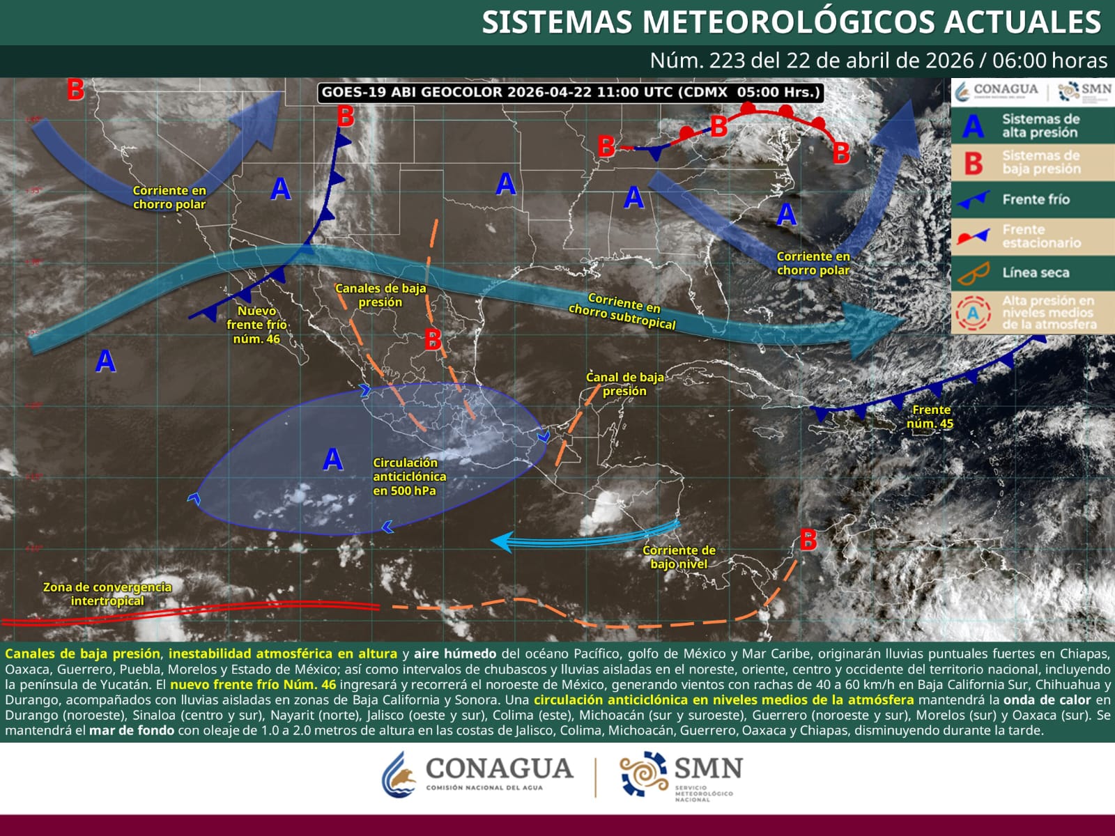 Saltillo, Coahuila de Zaragoza; 22 de abril de 2026.– La Secretaría de Gobierno, a través de la Subsecretaría de Protección Civil del Estado, informa que este día se prevén lluvias y vientos en la entidad, derivados de la presencia de canales de baja presión sobre la Mesa del Norte y del ingreso del frente frío número 46 por el noroeste del país.
