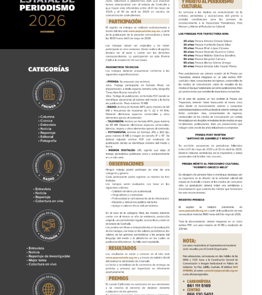 Saltillo, Coahuila de Zaragoza, a 15 de abril de 2026.- Con el propósito de reconocer la calidad y excelencia del periodismo en el Estado de Coahuila...
