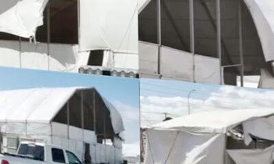 Los fuertes vientos registrados en Chihuahua rasgaron algunas lonas de techos y paredes de los mega campamentos para migrantes instalados en El Punto, en Ciudad Juárez....