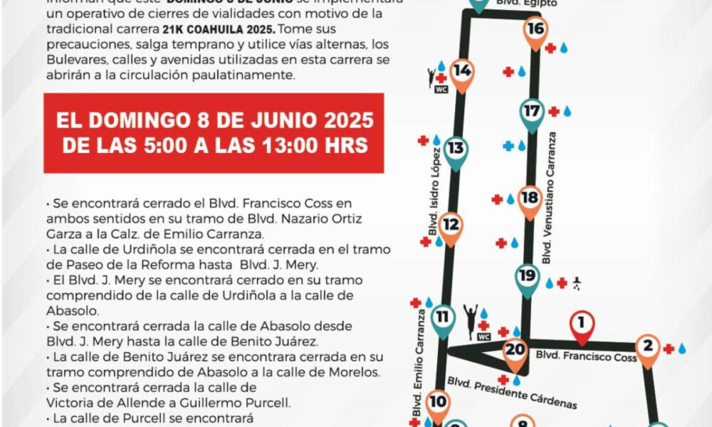 Pide a la ciudadanía tomar vías alternas Saltillo, Coahuila de Zaragoza; 05 de junio de 2025.- El Gobierno Municipal de Saltillo informó que este próximo domingo...
