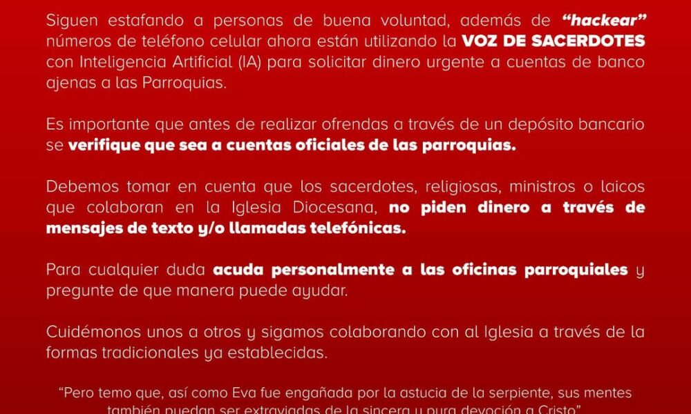 Por medio de un comunicado, este miércoles, la Diócesis de Saltillo informó que, por medio de Inteligencia Artificial (IA), personas están «hackeando» voces de sacerdotes para...